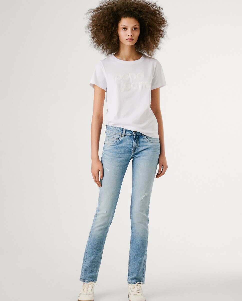 Vaquero recto de mujer tiro bajo con detalles rotos