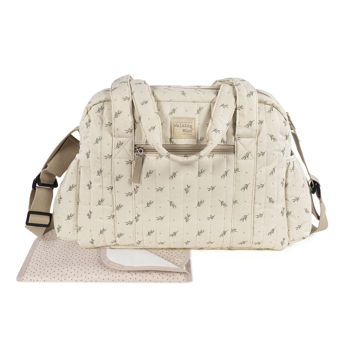 Bolso cambiador Mimosa Verde con estampado floral para silla de paseo que incluye cambiador para bebe. Bolsa canastilla muy ligera, resistente y de gran capacidad para llevar todo lo necesario para el paseo del bebe. Tiene multiples bolsillos para poder tener todo ordenado. Dispone en el exterior de dos bolsillos laterales para botellas o biberones y un bolsillo con cremallera frontal. En el interior incopora un bolsillo plastificado para la ropa húmeda, un bolsillo térmico para biberones y dos bolsillos para lo que necesites tener más a mano. La bolsa tiene un sistema universal de fijación, con 2 asas cortas ajustables que facilita la colocación en cualquier modelo de silla de paseo. También incorpora una asa larga para poder colgarla en el hombro y asas cortas para cogerla con la mano. Gran calidad y mucho estilo. Fabricada en algodón 100% con un tratamiento waterproof, de fácil limpieza a mano o a máquina a 30 °C. Walking Mum protege a tu bebé utilizando los mejores tejidos, libres de colorantes azoicos y sustancias nocivas para la salud. Nuestra colección Walking Mum está diseñada con un particular sello de estilo urbano y moderno que no pasa desapercibido, para vestir diferente los paseos con tu bebé. Las bolsas de maternidad de esta línea son más sport y prácticas, especialmente pensadas en mamás y papás modernos que aprecian los diseños más actuales y en tendencia sin dejar de lado la calidad y la funcionalidad de los accesorios que complementan y hacen más cómodos todos los paseos con sus bebés. Especificaciones: Materiales: 100% algodón con tratamiento waterpfoof. Medidas: 41X31X13 cm.