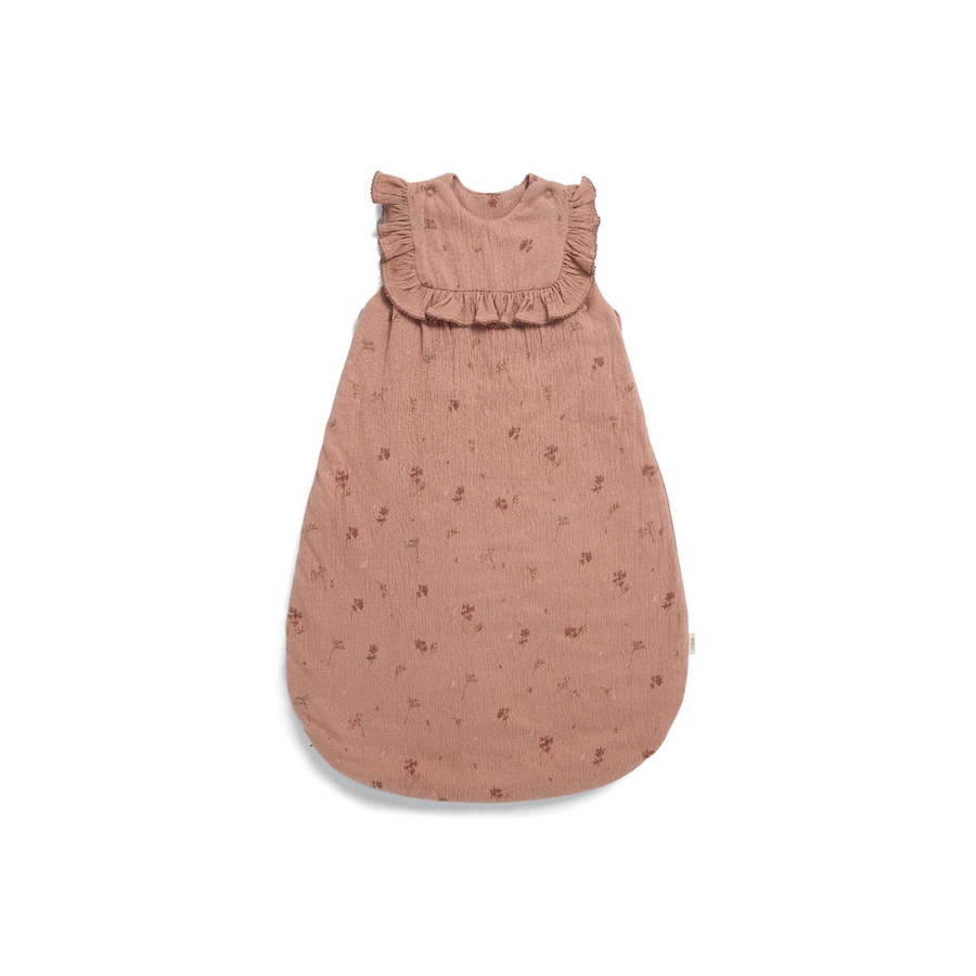 Nuestro saco de dmormir rosa palo tiene un precioso estampado floral de primavera con un suaje tejido de punto arrugado.