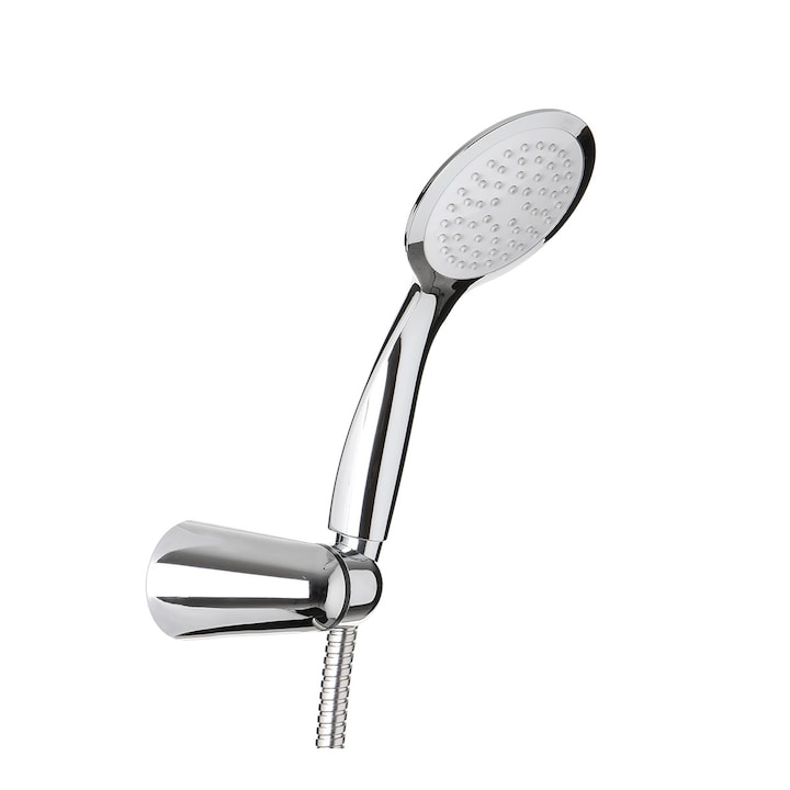 Conjunto de ducha con soporte multiposición, que incluye grifo de una posición de Ø 10 cm y flexo metálico de doble engatillado, ultra resistente, de 1,5 m, con cromado de alta durabilidad.