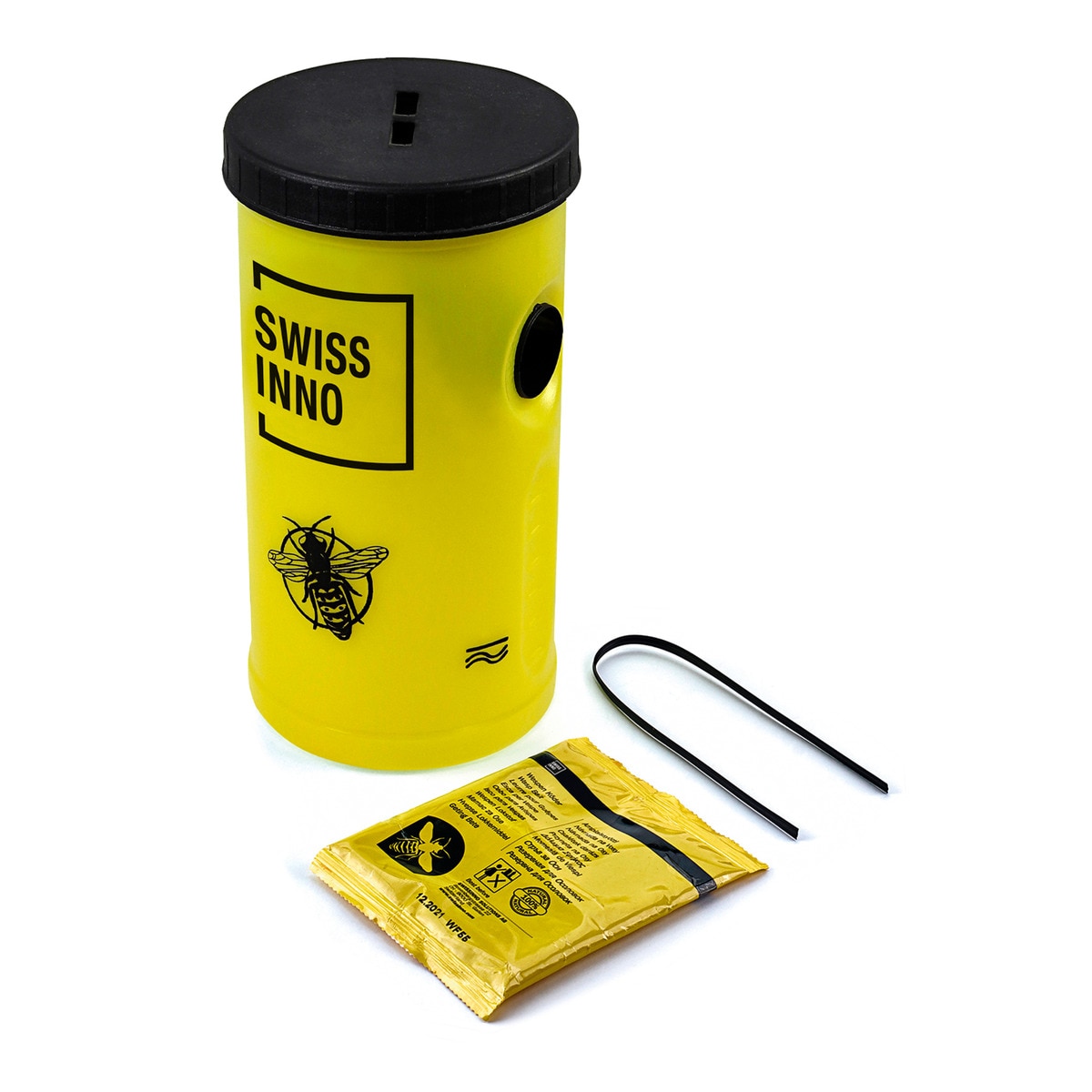 PRÁCTICA TRAMPA PARA AVISPAS: Este práctico set consta de una trampa para avispas amarilla de Swissinno que incluye un cebo especial no tóxico y un alambre para colgar.