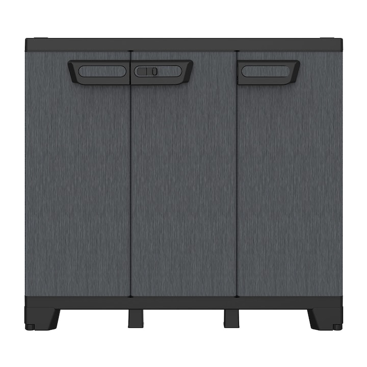 Armario bajo de resina de la marca Terry, diseñado como mueble multiusos. Fabricado en polipropileno, cuenta con tres puertas y patas regulables. Incluye un gancho y bisagras de plástico. Su interior se divide en dos compartimentos: uno sin estantes y otro con una balda regulable, con una capacidad de carga de 20 kg por estante, siempre que el armario esté fijado a la pared. Presenta un cierre anti-viento y la opción de asegurar las puertas con un candado, que no está incluido. Está fabricado con un 90% de plástico reciclado. Las dimensiones son 93.5 cm de alto, 102.0 cm de ancho y 39.0 cm de fondo, con un peso de 11.18 kg. No incluye montaje ni atrezzo.