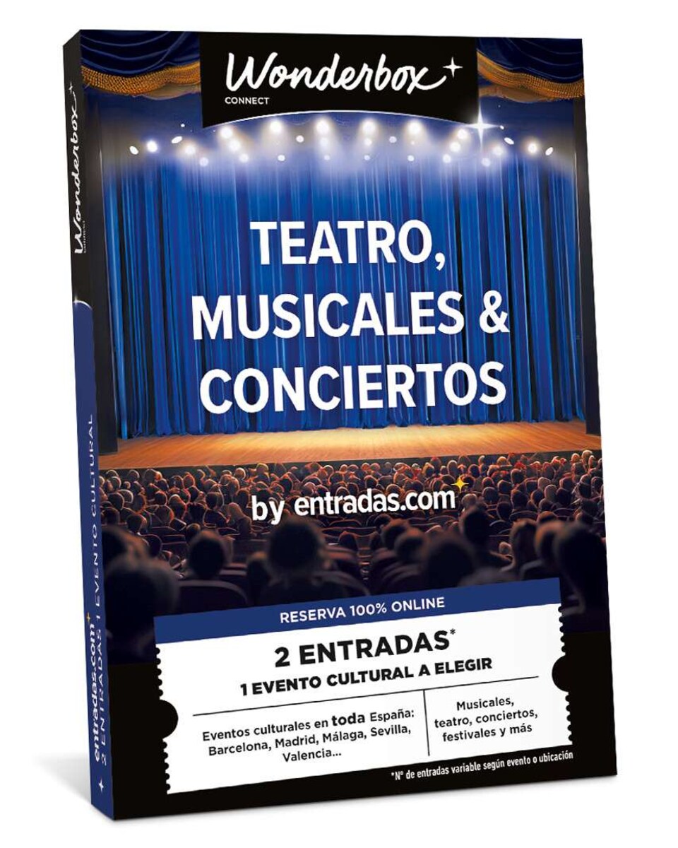 Entradas.com es la puerta a la mejor oferta de España del ocio y el entretenimiento en vivo. Incluye una selección de entradas para una amplia variedad de eventos: desde espectáculos teatrales y musicales, hasta conciertos... y mucho más. Perfecto para los amantes de la cultura y la diversión, Entradas.com permite elegir la experiencia ideal, ofreciéndote la libertad de disfrutar del mejor ocio en el momento que prefieras. ¡Un regalo perfecto para vivir momentos inolvidables y disfrutar del mejor entretenimiento! Este cofre es canjeable por 2 entradas* para 1 evento a elegir.