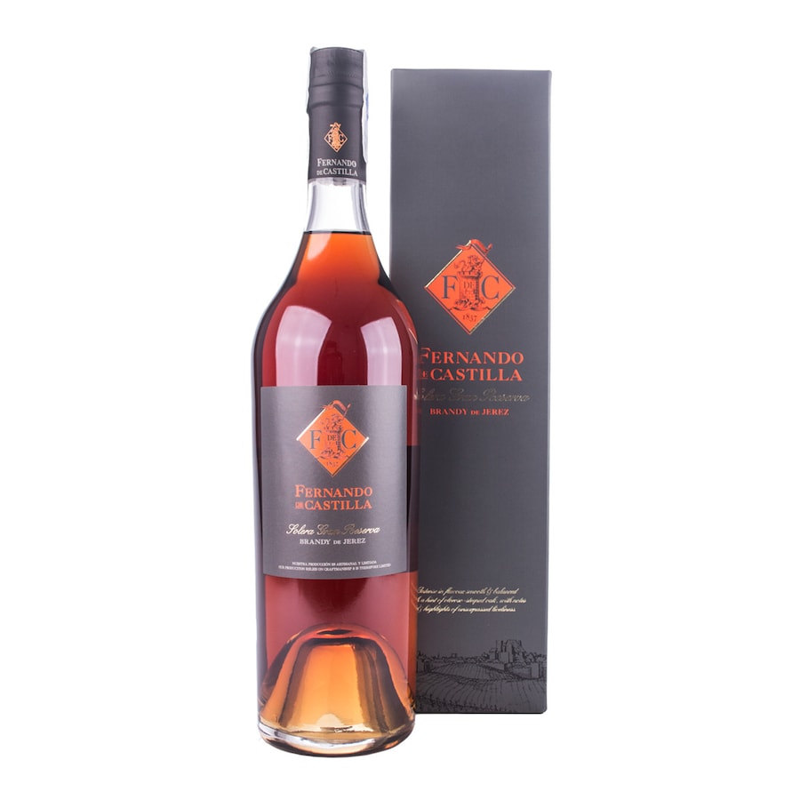 Los brandies de Fernando de Castilla provienen de selectos destilados de vinos blancos que, tras numerosos años de envejecimiento en barricas previamente utilizadas para producir vinos de Jerez, dan como fruto unos brandies de gran personalidad y nobleza. Los bodegueros han adoptado para el envejecimiento del brandy, el original y característico sistema jerezano de criadera y soleras, ya empleado en la crianza y añejamiento de los vinos, el cual, unido al previo envinamiento de las botas de roble americano, a las singulares características y estructuras de las bodegas y al microclima de que goza la zona, forman un conjunto de factores irrepetibles, que dan como resultado un producto único con personalidad propia y cualidades organolépticas bien definidas y originales. Las holandas de alquitaras seleccionadas son envejecidas primero en añadas y después por el sistema de criaderas y soleras en botas de roble envinadas con olorosos y amontillados viejos de jerez. Color caoba dorado, con notas de roble. Amplio, limpio y muy elegante.