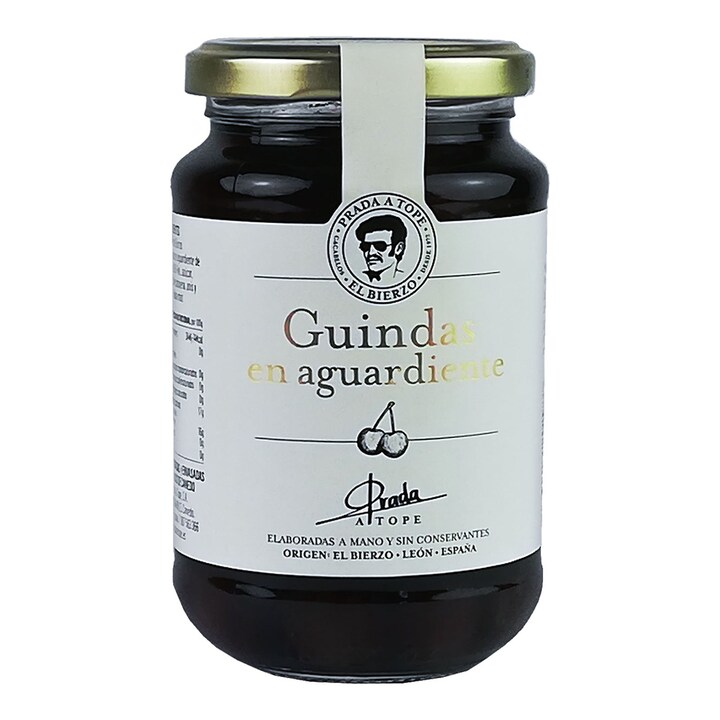 Guindas del Bierzo envasadas en aguardiente de orujo de uva de 50% vol, azúcar, canela, hierbabuena, anís y café. Producto tradicional elaborado a mano, sin colorantes ni conservantes. Ingredientes: guindas, aguardiente de orujo de 50% vol, azúcar, canela, hierbabuena, anís y café.