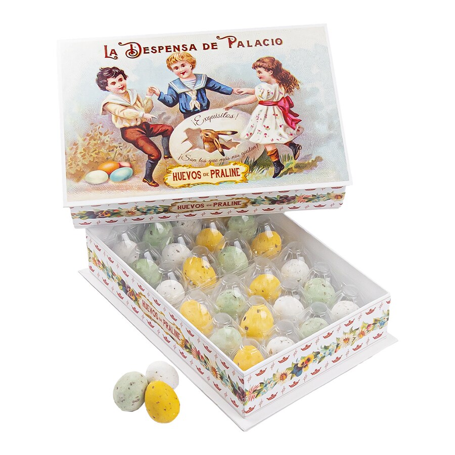Los Huevos de Praliné de La Despensa de Palacio son miniaturas grajeadas en forma de pequeños huevos, rellenos de un exquisito praliné con chocolate. Este producto es originario de Sevilla, España, y se presenta en un formato de caja con un peso total de 240 gramos. Se trata de una auténtica delicia que satisface los paladares tanto de mayores como de pequeños, convirtiéndolos en un dulce ideal para cualquier ocasión.