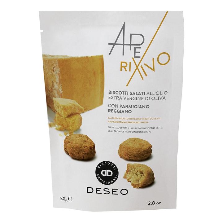Galletitas saladas con aceite de oliva y parmesano de la marca Deseo. Estas galletas son ideales como aperitivo. Producto de Europa, específicamente de Italia, presentado en un formato de bolsa con un peso de 80 g.