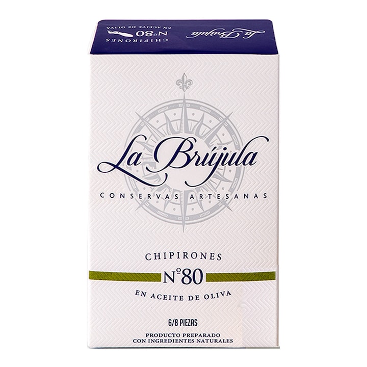 Chipirones en aceite de oliva rellenos de su propia carne. Pequeños calamares capturados de forma sostenible (potera), vaciados y limpios de piel. Se rellenan de sus propios tentáculos para ser escaldados en agua antes de empacarlos uno a uno en la lata. Jugosos. Cubiertos de aceite de oliva. Estrictamente seleccionados por su tamaño, los de mayor calidad y frescura. La limpieza, preparación y enlatado de los chipirones se realiza a mano. La Brújula es y ha sido considerada durante 4 años como joya de la corona española. El sabor de sus conservas es difícil de superar. Se ha convertido en un referente en el ámbito de las conservas del mar. La Brújula pertenece a una selecta minoría de conservas que se integran en la oferta gastronómica de los mejores chefs del mercado nacional y restaurantes con varias estrellas Michelín. Utilizan estas conservas como ingrediente de sus creaciones, ya que en realidad son materia prima de excelente calidad para la más alta cocina. El pilar sobre el que se sostiene La Brújula es la materia prima. Sólo se utilizan los mariscos y pescados de primera calidad, autóctonos y naturales, capturados mediante los métodos tradicionales que garantizan su máxima expresión. Los productos de La Brújula tienen un indiscutible sabor a mar, textura firme y jugosa y son dispuestos en la lata con un gran mimo. Producto elaborado en Galicia. Origen, materia prima y tradición conservera.