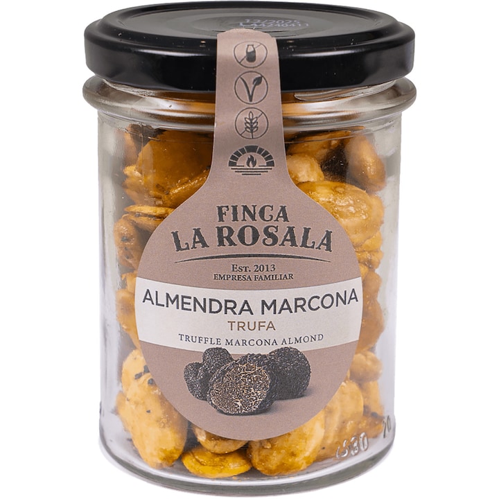 Las Almendras Marcona con Trufa Gourmet de Finca la Rosala son un exquisito aperitivo elaborado con almendras Marcona sin piel, que han sido tostadas a mano. Este producto destaca por su mezcla especial que incluye azúcar de caña integral, trufa sólida (Tuber Aestivum) y aroma de trufa natural, lo que le confiere un sabor profundo y delicioso. Son ideales para acompañar ensaladas, pasteles y tartas, así como para disfrutar como aperitivo individual o junto a embutidos. También son perfectas para degustar con bebidas. Este producto es sin gluten y proviene de Calzada de Calatrava, en la provincia de Ciudad Real, España, dentro de la región de Castilla La Mancha. Se presenta en un tarro con un contenido de 90 gramos.