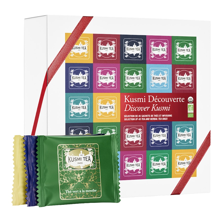 Surtido de 45 bolsitas de té que incluye 9 mezclas emblemáticas de Kusmi Tea. Contiene té negro Anastasia, té negro Prince Wladimir, White Anastasia, Tropical White, té verde de menta, té verde de jazmín, infusión AquaRosa, infusión AquaExotica e infusión Be Cool. Las mezclas de té Anastasia y Prince Wladimir están basadas en recetas de Earl Grey. White Anastasia y Tropical White combinan té blanco con sabores de azahar, limón, mango y fruta de la pasión. El té verde de menta y jazmín ofrece un sabor fresco y delicado. AquaRosa y AquaExotica son tés sin cafeína. Be Cool es una infusión de hierbas. Los ingredientes incluyen té verde de China y flores de jazmín. La clasificación oficial es de París, con origen en Francia, Europa.