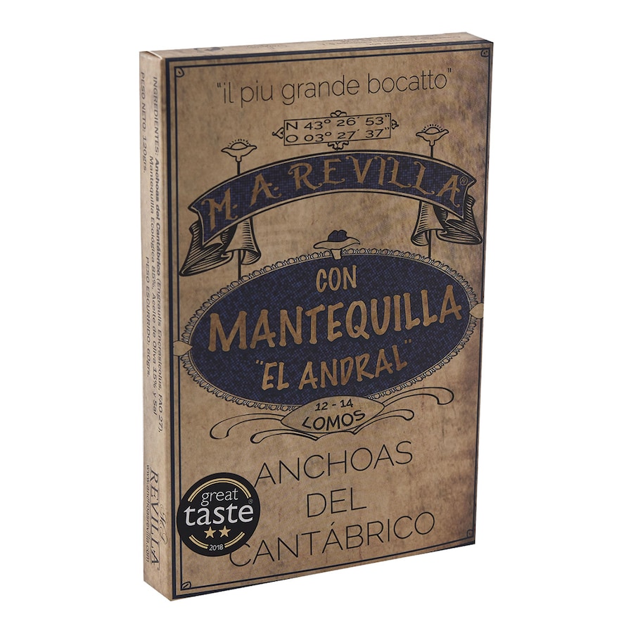 Las Anchoas del Cantábrico con mantequilla ''El Andral'' de la marca Revilla son un producto gourmet que destaca por su sabor suave y su hermosa textura, convirtiéndose en una verdadera delicia para los amantes de la buena gastronomía. Estas anchoas, provenientes de Santoña, Cantabria, se presentan en un formato de lata que contiene 60 gramos de exquisitas anchoas en mantequilla ecológica. La combinación de la dulzura de la mantequilla con el salado de la anchoa crea un juego de sabores único y sorprendente. Este método de conservación, que data de finales del siglo XIX en Italia, rinde homenaje a los salazoneros italianos que, ante la escasez de capturas en su costa, encontraron en las aguas cantábricas una fuente de bocartes. Se recomienda dejar la lata abierta a temperatura ambiente durante 30 minutos antes de consumir para disfrutar de la mantequilla en su textura ideal. Este producto se conserva de manera semi refrigerada entre 3º y 5º C, asegurando su frescura y calidad.