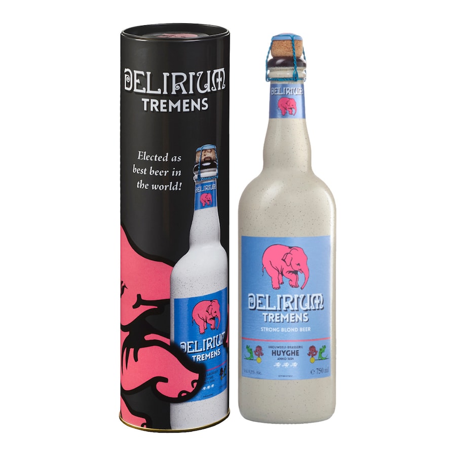 Estuche de metal cilíndrico con botella de cerveza Delirium Tremens 75 cl. La mejor cerveza del mundo. Tonalidad rubio pálido, brillo fino y regular. Espuma de cabeza fina y estable. Aroma ligeramente maltoso y picante. Amargor de 24,5 IBU. Los 8,5º de alcohol se notan en boca. El sabor se caracteriza por su redondez. El retrogusto es fuerte, largo, seco y amargo.