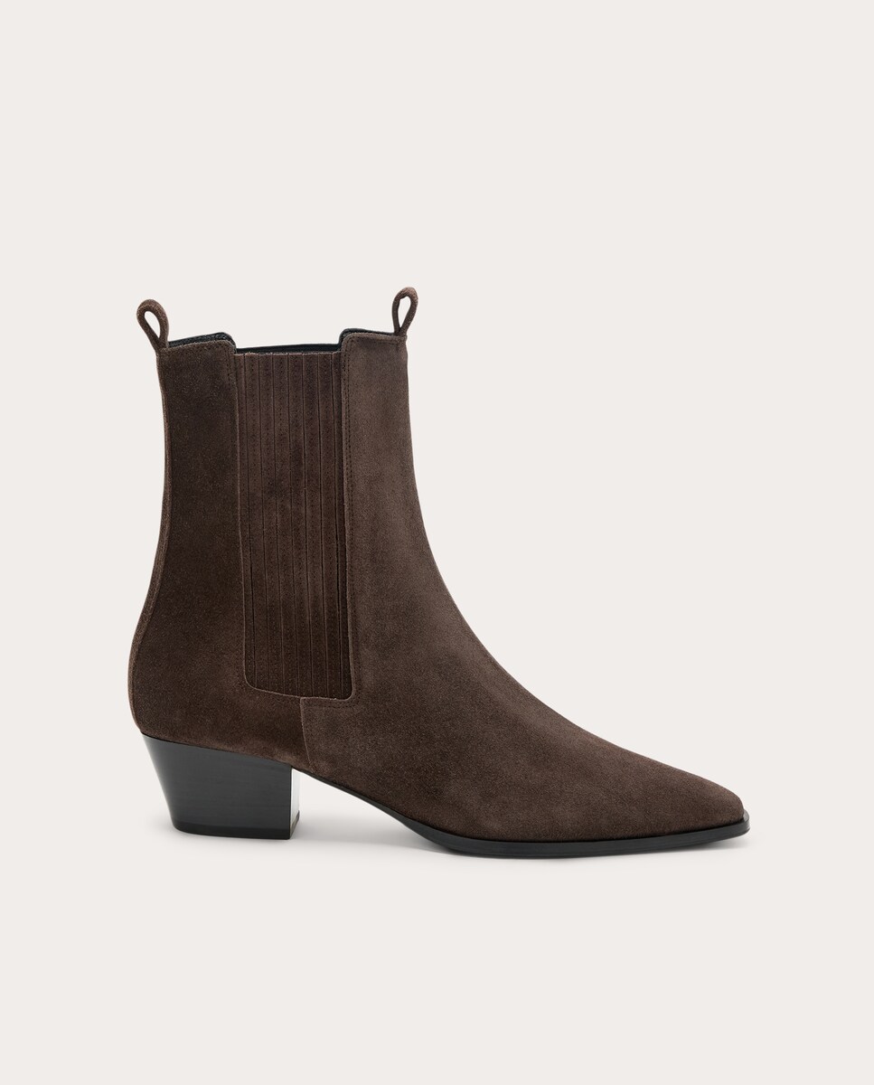 Botines Agata de ante con silueta de punta, paneles elásticos laterales y tacón de 5 cm.