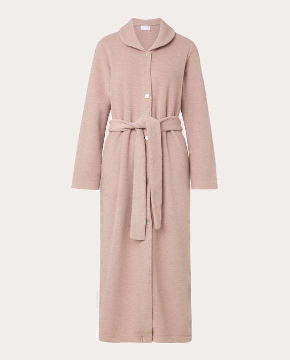 Bata larga con cuello cerrado y ajuste a la cintura con cinturón y botones frontales.