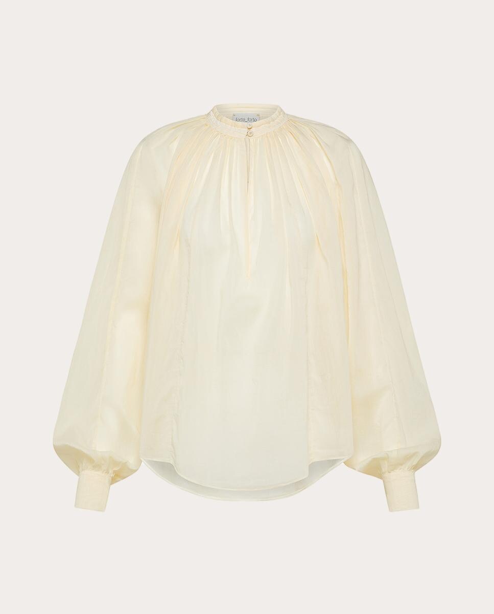 Blusa de algodón con cuello mao ribeteado, silueta fruncida y manga larga abullonada con puños abotonados.