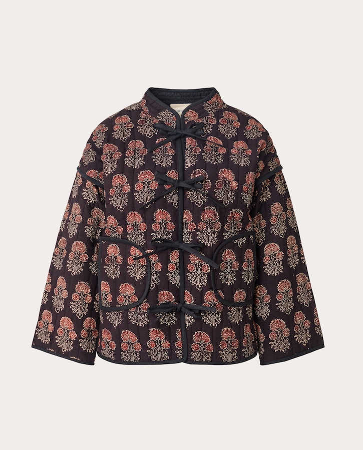Chaqueta Indira de algodón estampado, cuello mao, bolsillos de parche y cierre de lazadas.