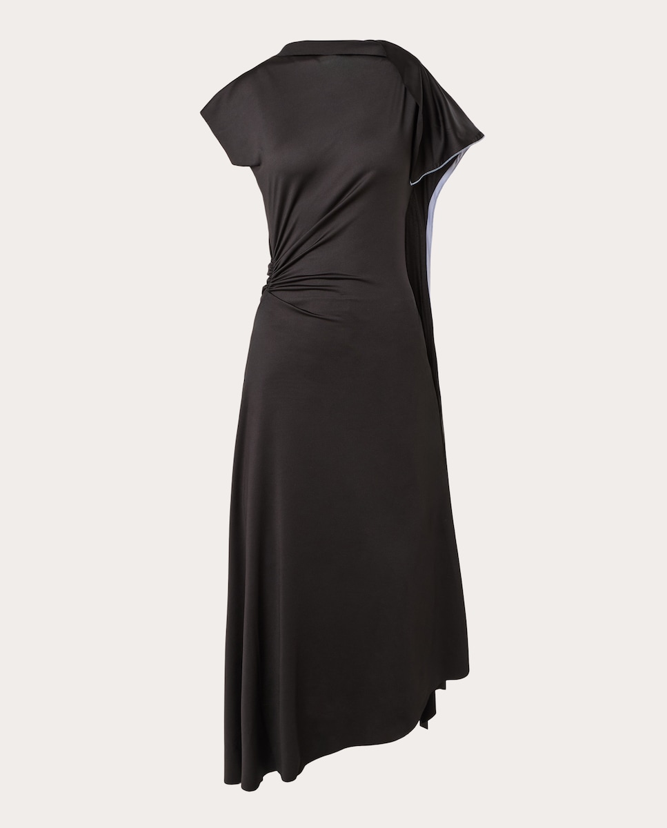 Vestido midi en tejido satinado con escote drapeado, sin mangas, detalle fruncido en la espalda y dobladillo asimétrico.