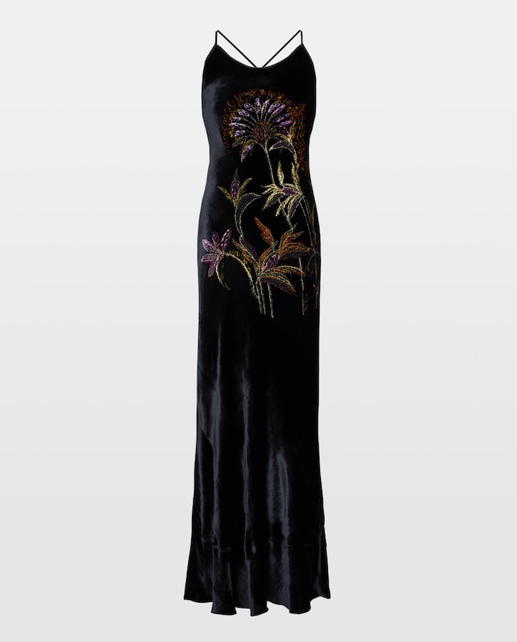 Vestido midi de terciopelo con detalle estampado, escote redondeado, espalda descubierta y dobladillo festoneado.