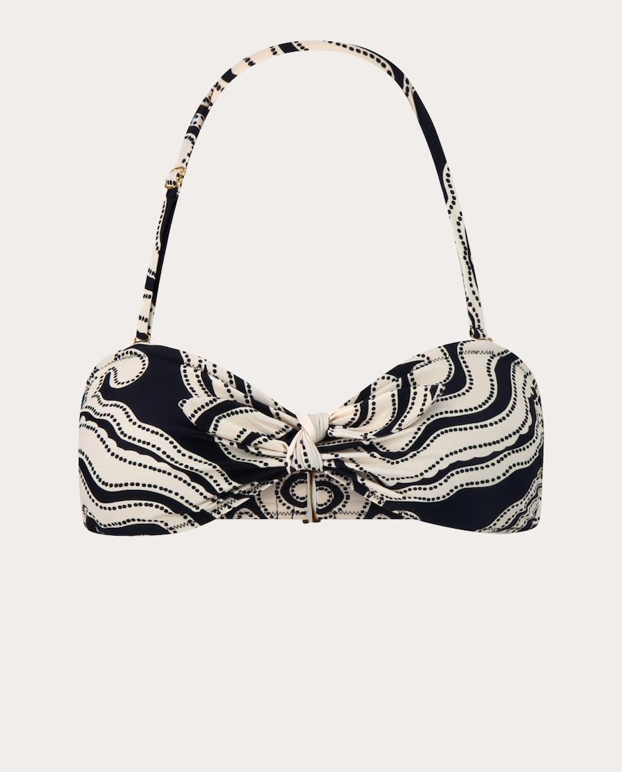 Top de bikini Ava estilo bandeau totalmente forrada que cuenta con una correa desmontable para el cabestro y un lazo en el busto. Además, tiene un gancho trasero y un acolchado extraíble.