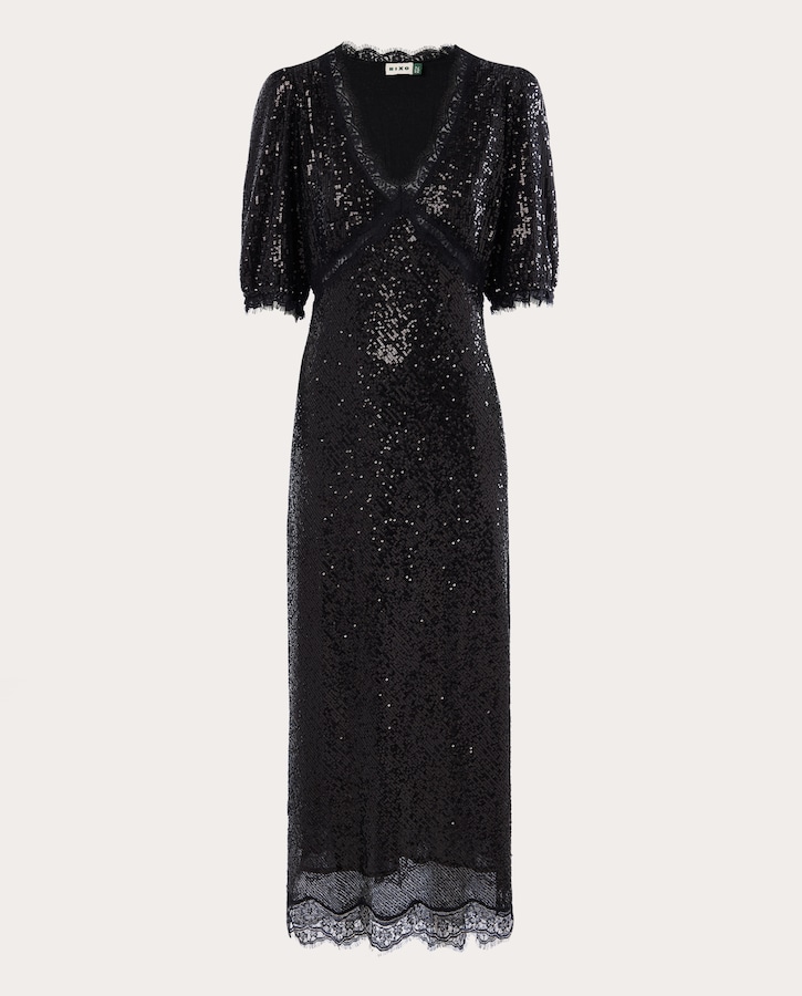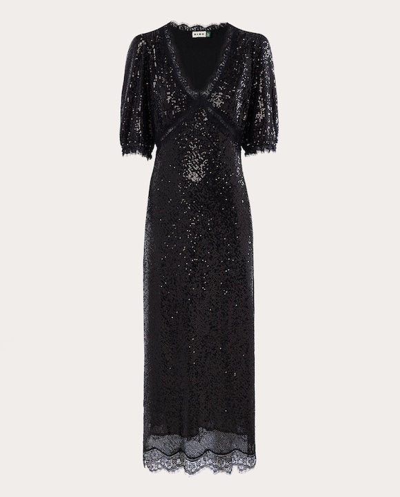 Vestido largo Verena confeccionado en tul con lentejuelas, ligero y elástico, con un delicado encaje de pestañas, cierre de cremallera lateral oculto, parcialmente forrado, manga corta y escote en V. Diseñado para quedar ligeramente ajustado bajo el busto y con vuelo desde la cintura.