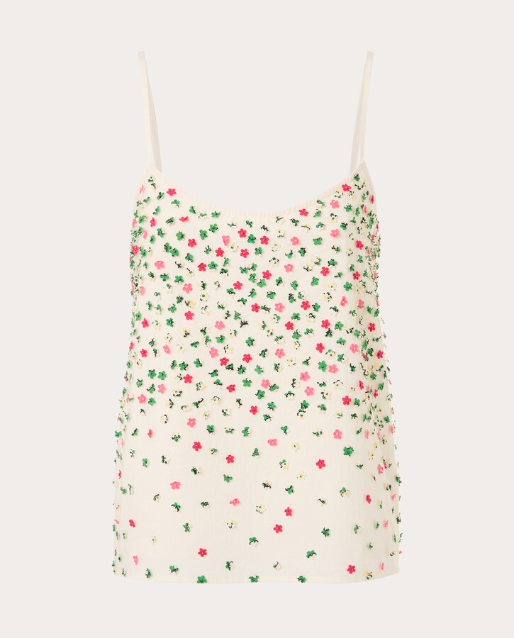 Top elaborado con algodón que presenta un patrón floral bordado en la parte frontal. Cuenta con tirantes finos y ajustables, un escote recto, un ligero fruncido en la espalda y un corte ajustado.