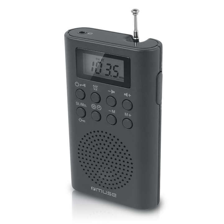 La Radio Digital Muse M-03 R es un radio despertador que ofrece una experiencia de escucha versátil y funcional. Cuenta con un sistema PLL que permite sintonizar hasta 20 emisoras de FM, facilitando la búsqueda de estaciones de manera manual o automática. Incluye un despertador que se puede configurar para sonar con la radio o con un zumbador, además de funciones como repetición de alarma y temporizador de sueño. Está equipada con una antena telescópica para mejorar la recepción de señal y un altavoz incorporado que proporciona sonido claro y nítido. Las conexiones disponibles son un mini jack de 3,5 mm y un conector DC in jack.