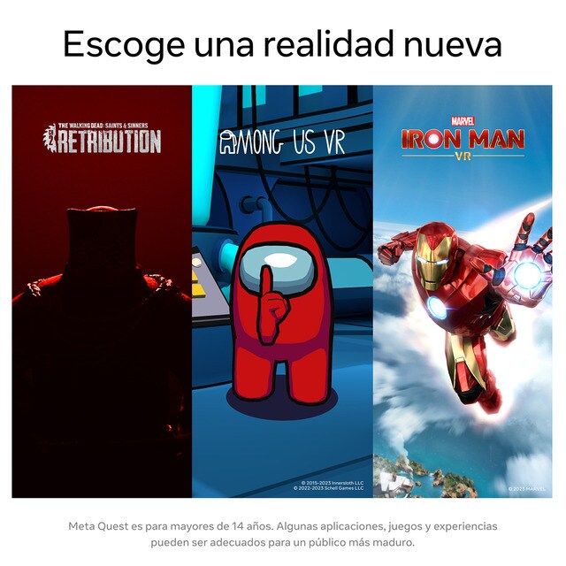 El audio posicional 3D, el seguimiento de las manos y la retroalimentación háptica hacen que los mundos virtuales parezcan reales. La batería incorporada te permite explorar más durante más tiempo mientras descubres una creciente biblioteca con más de 350 títulos de juegos y aplicaciones sociales/multijugador, de fitness y entretenimiento. Los increíbles espacios sociales y escenarios multijugador te permiten conocer, jugar y crear comunidades con gente de todo el mundo. Viaja por universos fantásticos de gran éxito cinematográfico, asústate con aventuras de terror o colabora con tus colegas en espacios de trabajo innovadores. Siéntate en primera fila con tus amigos y familiares en películas y eventos en directo, encuentra tus nuevos compañeros de entrenamiento o únete a misiones con otros aventureros. Además, puedes acceder a más de 1000 títulos de la biblioteca Quest conectando tus gafas de realidad virtual a un ordenador compatible con juegos (el PC y el cable se venden por separado).