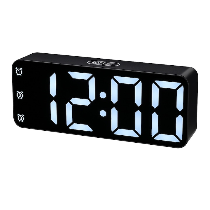 Reloj despertador multifuncional que combina las funciones de reloj, termómetro y calendario. Ofrece dos modos de visualización y permite ajustar el brillo en tres niveles. Incluye control por voz para facilitar su uso. Muestra la temperatura interior en grados Celsius o Fahrenheit. Dispone de función de repetición de alarma. Cuenta con un modo de ahorro de energía para eficiencia en el consumo. Se alimenta mediante conexión de corriente continua o pilas, que no están incluidas. Funciona con formato horario de 12 o 24 horas.