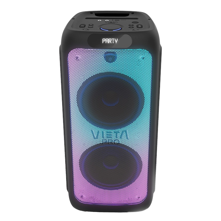 El altavoz portátil de alta potencia de Vieta Pro ofrece una experiencia de audio versátil. Dispone de conectividad Bluetooth 5.3 para una conexión inalámbrica estable y de alta calidad. La potencia de salida es de 500 W, proporcionando un sonido potente y nítido. La batería permite hasta 10 horas de reproducción continua. Incluye un reproductor USB para reproducir música desde dispositivos de almacenamiento y un lector de tarjetas para tarjetas de memoria. También cuenta con radio FM para sintonizar emisoras. El panel RGB LED añade efectos visuales que se sincronizan con la música. Permite la conexión dual, conectando simultáneamente dos dispositivos a través de Bluetooth u otras opciones. Incluye un micrófono, útil para discursos, presentaciones o karaoke. La conexión estéreo inalámbrica permite conectar dos dispositivos para disfrutar de sonido en estéreo.