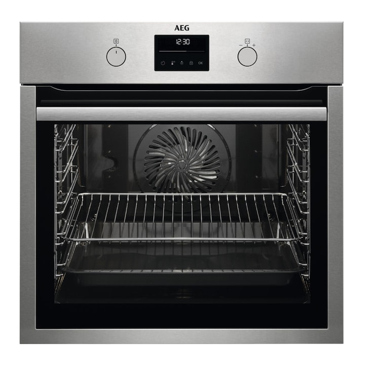 El horno pirolítico AEG BPS335160M de la Serie 6000 SurroundCook es un electrodoméstico independiente que ofrece una amplia variedad de funciones de cocción, incluyendo gratinado, cocción convencional, descongelar y una función especial para pizza. Este modelo cuenta con un sistema de autolimpieza pirolítico que convierte la suciedad en cenizas, facilitando su eliminación. Su diseño incluye mandos escamoteables y una puerta con cuatro cristales, lo que proporciona un aspecto elegante y moderno. Además, el horno está equipado con un anillo térmico adicional que asegura una cocción uniforme, permitiendo utilizar hasta tres bandejas simultáneamente. Con un volumen de 71 litros, este horno también ofrece un calentamiento rápido y una regulación electrónica de la temperatura, con un rango que va desde 30 °C hasta 300 °C. Entre sus características de seguridad se incluyen un bloqueo para niños y un sistema de desconexión automática. El horno también dispone de una iluminación halógena que mejora la visibilidad en su interior. Incluye accesorios como una bandeja pastelera, una grasera y una parrilla cromada, lo que lo convierte en una opción versátil para cualquier cocina.