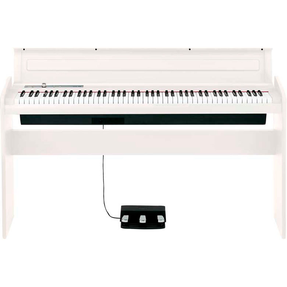 Piano digital KORG LP-180 acabado en blanco con tapa y tres pedales.