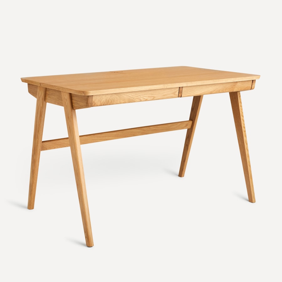 Mesa escritorio con estructura de madera roble. El tablero es de chapa de madera de roble (MDF) cubierta por una capa de madera maciza y tiene las tapas posteriores abatibles para almacenar y organizar. Las patas son de madera maciza.