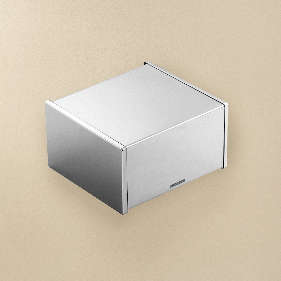 Portarrollos con tapa en latón y plástico con acabado cromo, que conjuga formas circulares y cuadradas permitiendo la máxima versatilidad.