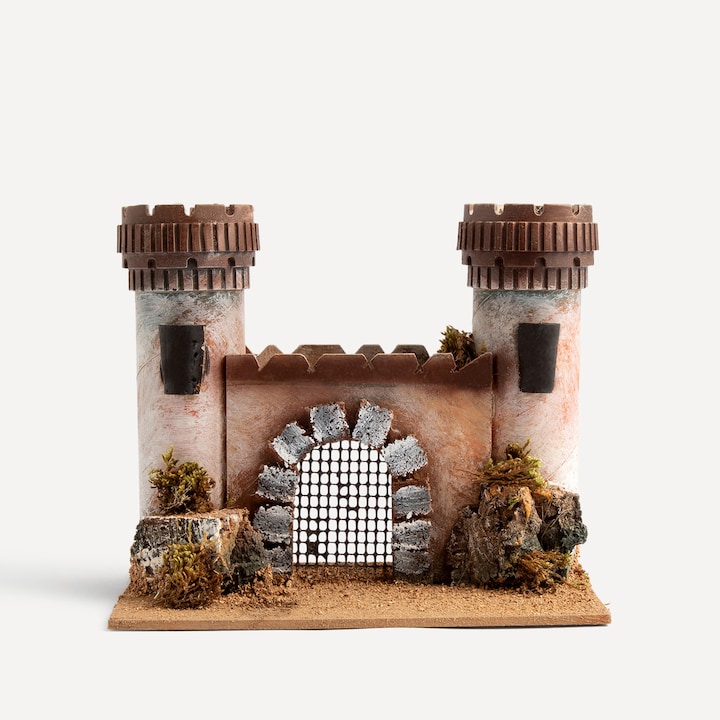 Clásica entrada para el castillo de Herodes del Belén formada por dos torres redondas y puerta con reja. Está realizada en corcho.