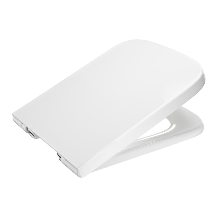 Tapa y aro lacado con caída amortiguada para inodoros Roca Dama. Bisagras de latón cromado. Material antibacteriano.