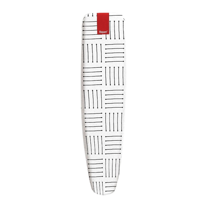 Su discreto fondo blanco con estampado en negro propicia que combine y armonice con multitud de fundas para la tabla de planchar.