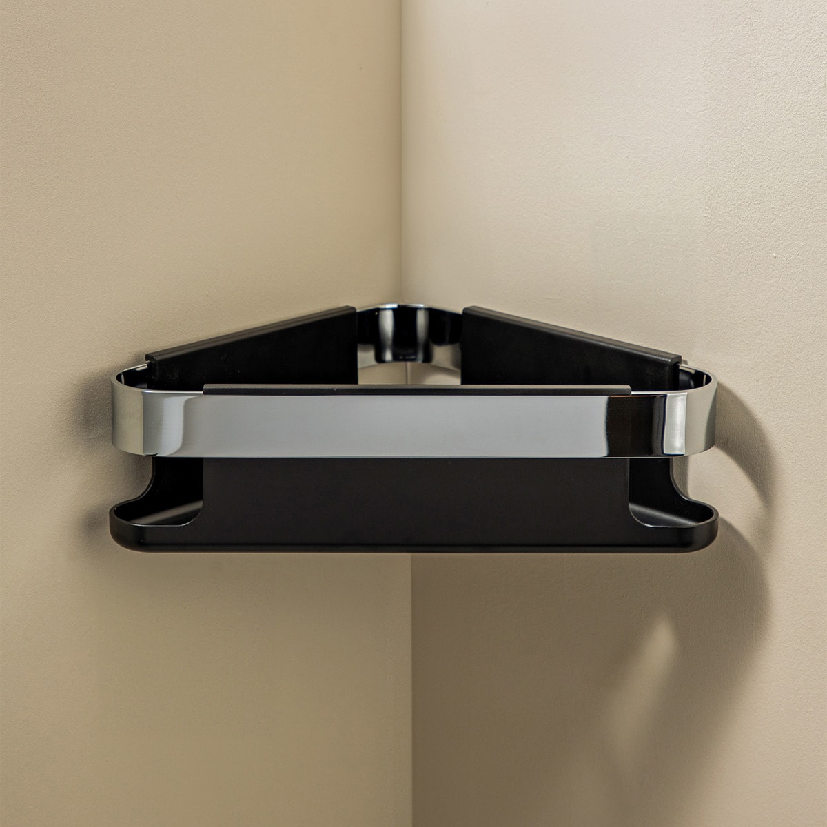 Jabonera de ducha triangular que combina el acero inoxidable y el plástico en un maridaje inteligente que aprovecha lo mejor de cada material. La conjugación entre el color metálico y el negro también ofrece un resultado que transmite modernidad.