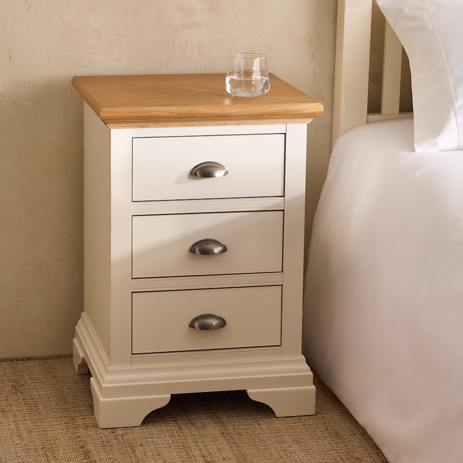 Mesita de noche hecha en MDF (fibra de madera prensada) lacada en blanco roto con superficie de madera maciza de roble natural barnizado. Tiene 3 cajones con tirador metálico.