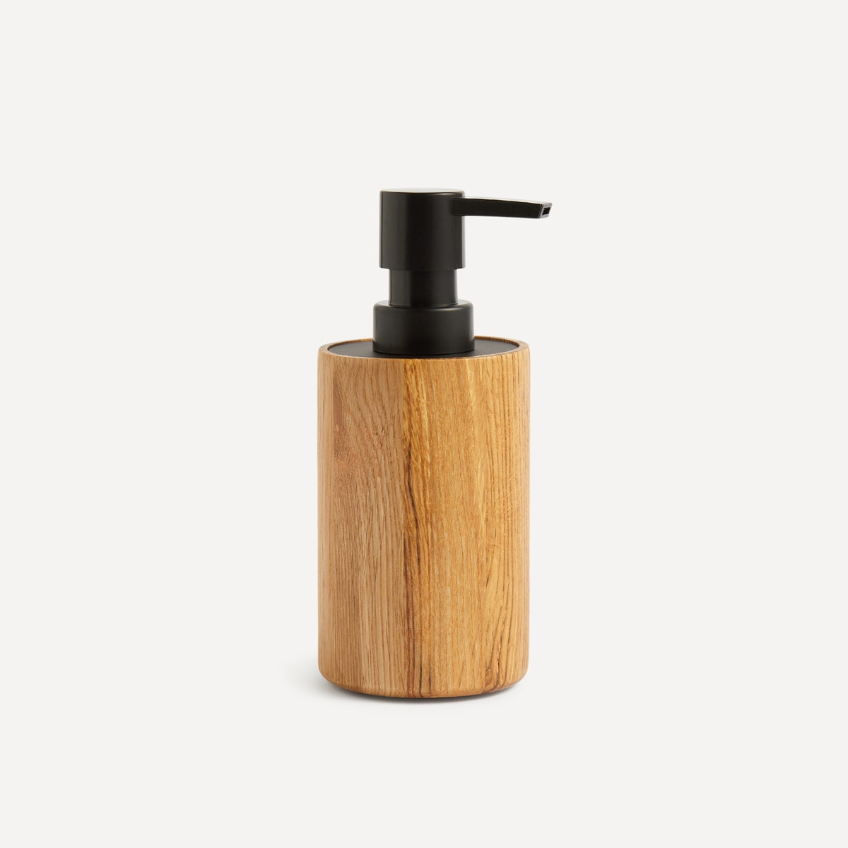 Dosificador de jabón para encimera realizado en madera de bambú y metal. El bambú es un material natural, hipoalergénico y antibacteriano, además de sostenible.