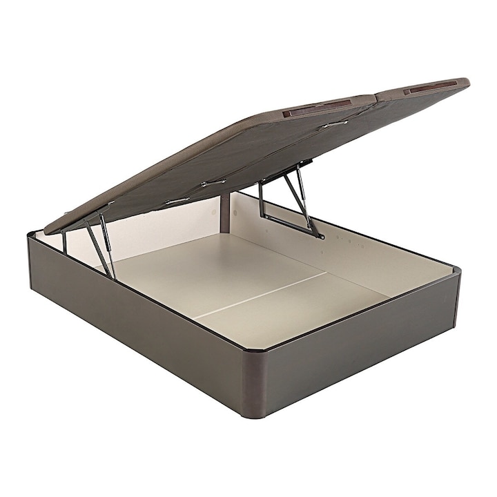 El abatible queda directamente apoyado en el suelo con una altura total de 36 cm y una altura útil de 30 cm. Cada una de las tapas cuentan con una estructura metálica de acero de gran resistencia, reforzada con 5 travesaños transversales y un tirador de madera en cada tapa que, junto a su sistema de amortiguadores neumáticos, permite abrir de una sola vez y fácilmente el canapé, elevando simultaneamente ambas tapas.
