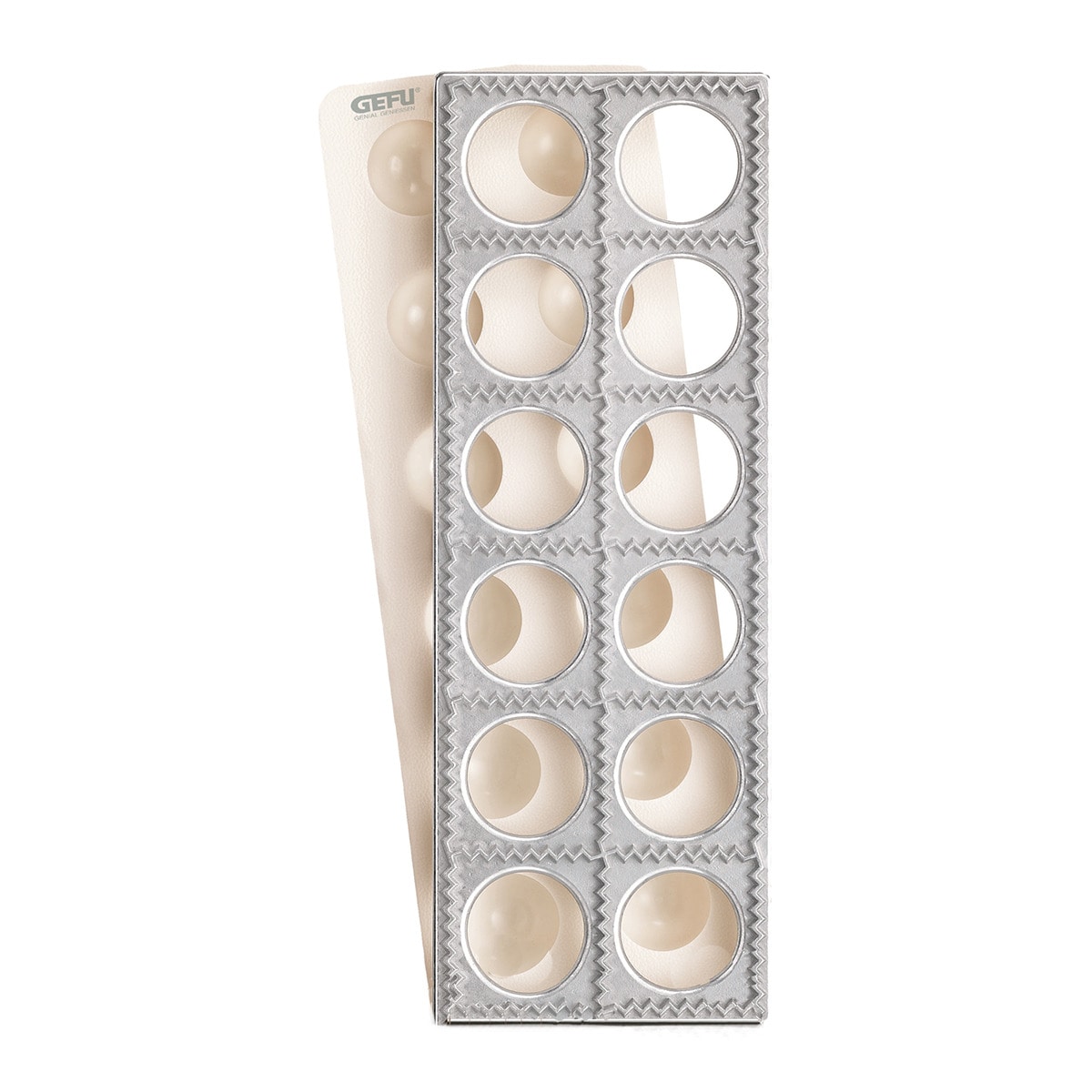 Este set de Gefu te permitirá elaborar hasta 12 raviolis simultáneamente de forma rápida y efectiva. El set está compuesto por 3 piezas: un molde base fabricado en aluminio, una plantilla para dar forma al ravioli y un pequeño rodillo de madera, muy útil para sellar la masa y definir la forma del ravioli cuadrado.
