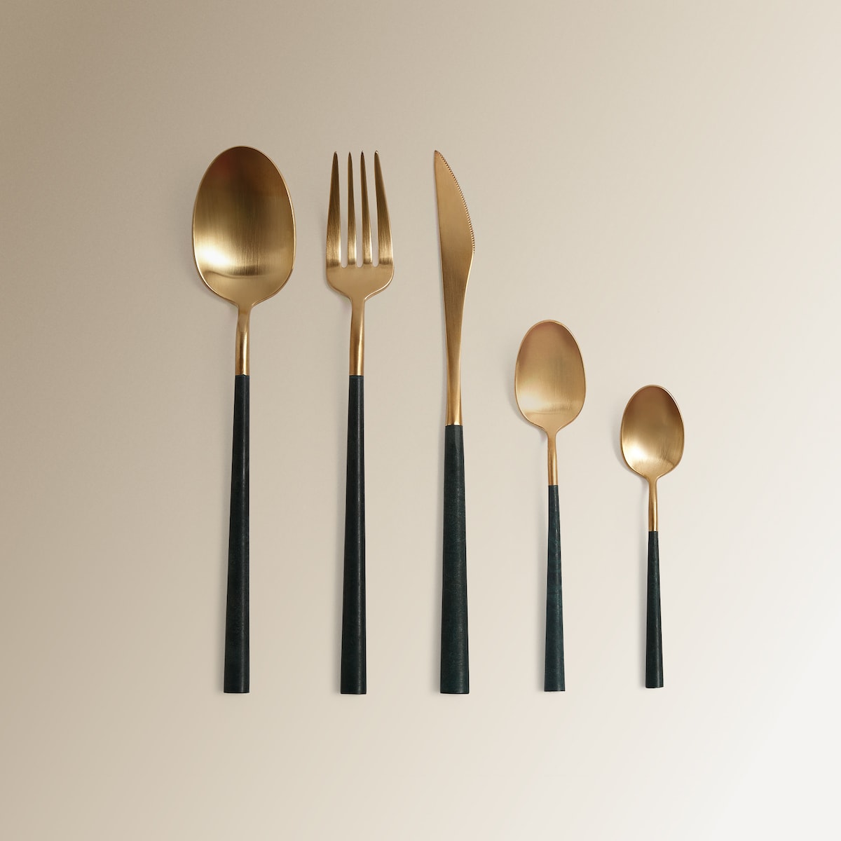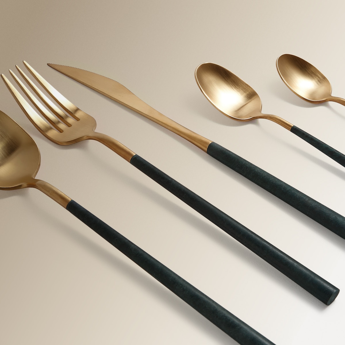 Cuchillo de mesa de la serie Neo fabricado en acero inoxidable con baño de oro de 24 quilates, y decorado con un fino mango de fibra y resina en color verde.
