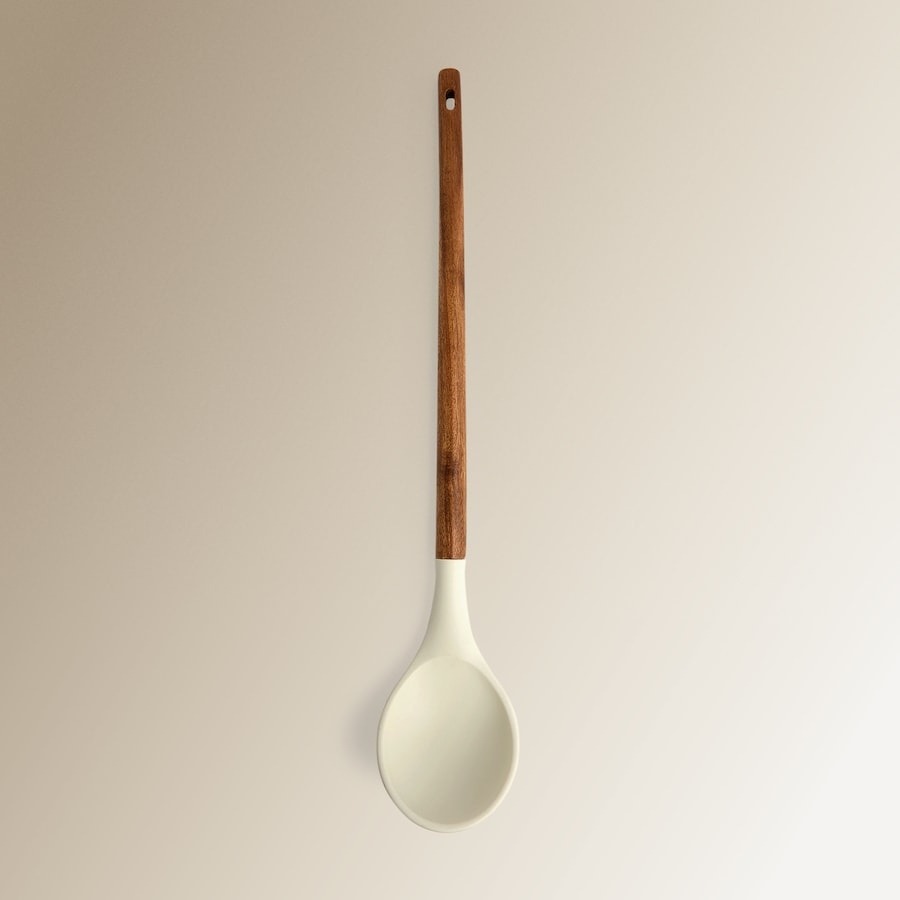Cuchara de cocina perfecta para mover los alimentos mientras se cocinan tanto en sartenes como en cacerolas. El mango está fabricado en madera de acacia y la cuchara es de silicona, un material perfecto para la cocina, ya que no absorbe ni deja olores ni sabores.