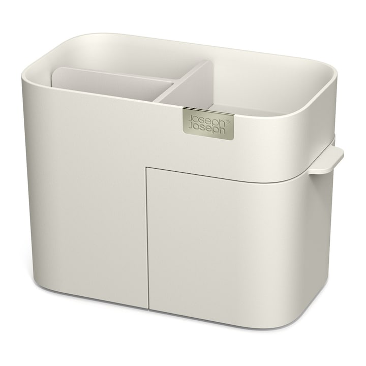 Organizador compacto de cosméticos que cuenta con compartimentos más y menos profundos para guardar todo tipo de objetos como las brochas de maquillaje, las máscaras de pestañas y las sombras de ojos.