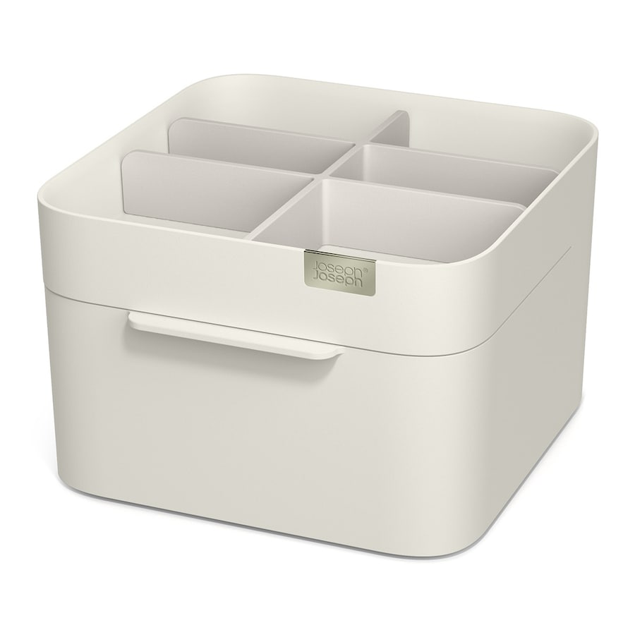 Organizador de cosméticos con compartimentos más y menos profundos para guardar todo tipo de objetos como las brochas de maquillaje, las máscaras de pestañas y las sombras de ojos.