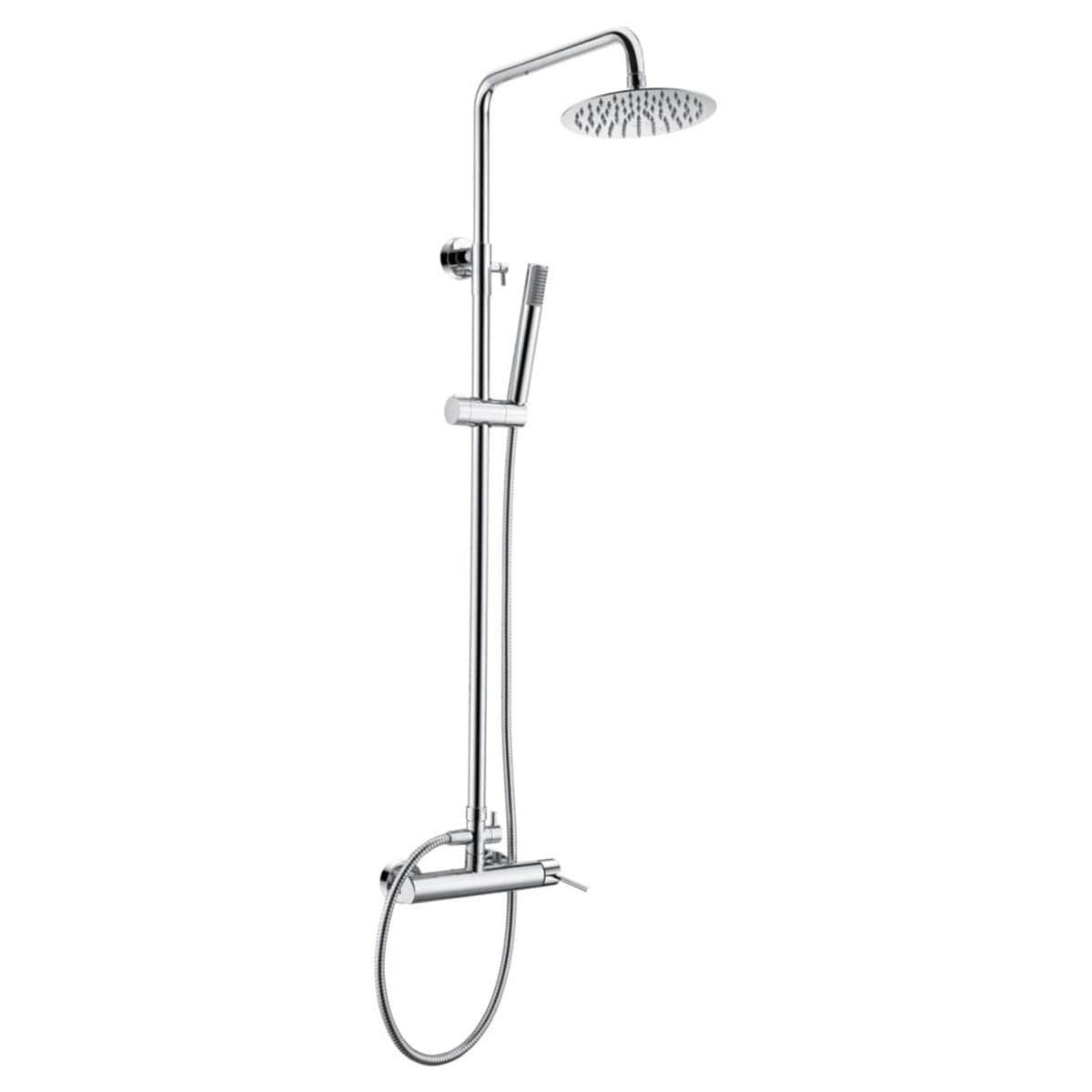 Conjunto de ducha monomando serie Milos Stick en acabado cromado, barra de ducha extensible, cuerpo de la griferia de latón cromado, rociador extraplano de 20 cm de diámetro y antical, cartucho cerámico de 35mm, incluye flexo y mango.