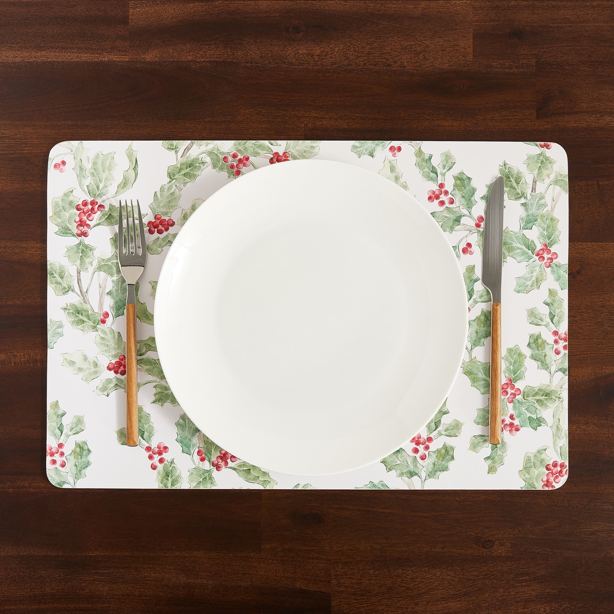 Mantel individual elaborado en MDF con estampado navideño de hojas de acebo.