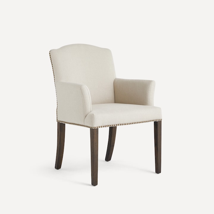 Sillón de comedor con estructura de madera de roble barnizada en tono oscuro y tapicería en un agradable y fresco tejido de lino.