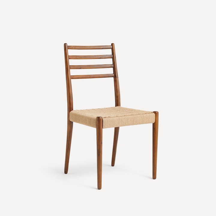 Silla de comedor con estructura de madera de nogal y asiento de ratán trenzado.
