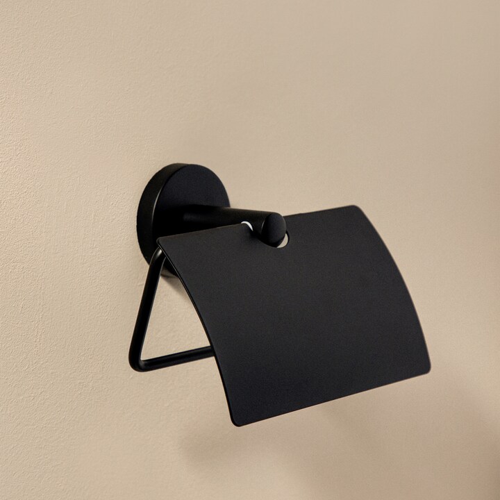 Portarrollos con tapa hecho en latón y otras aleaciones metálicas con acabado electrolítico anticorrosión que protege el accesorio de la incidencia de la humedad. Se fija a la pared mediante tornillería.